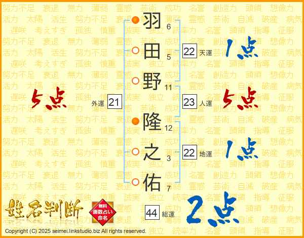 羽(6画)田(5画)野(11画) 隆(12画)之(3画)佑(7画)