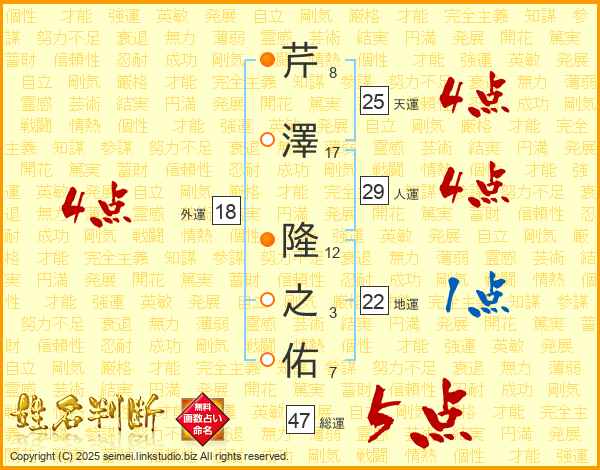 芹(8画)澤(17画) 隆(12画)之(3画)佑(7画)
