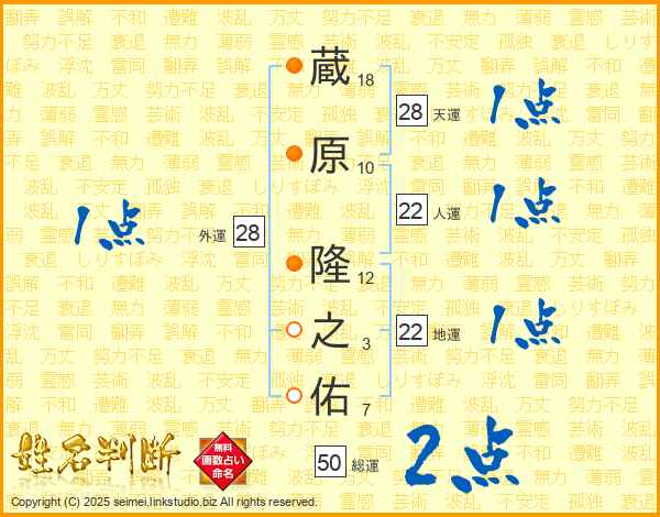 蔵(18画)原(10画) 隆(12画)之(3画)佑(7画)