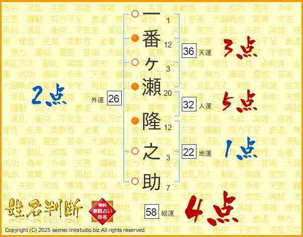 一番ヶ瀬隆之助さんの総運は58画の4点!