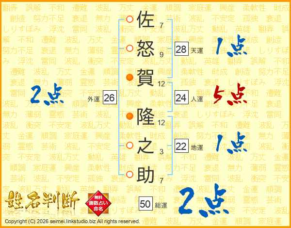 佐(7画)怒(9画)賀(12画) 隆(12画)之(3画)助(7画)