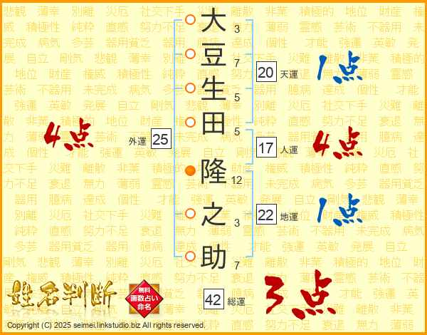 大豆生田隆之助さんの総運は42画の3点!