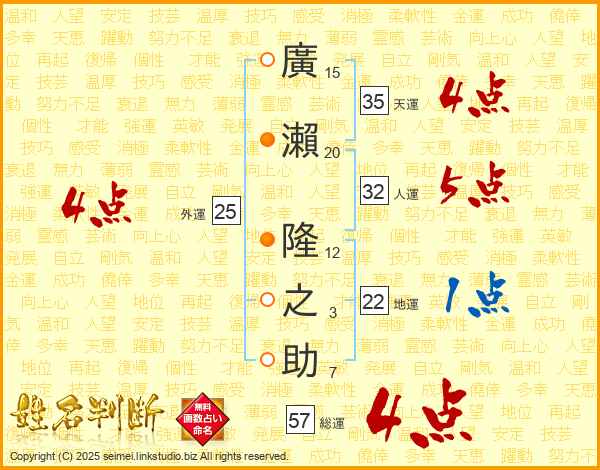 廣(15画)瀨(20画) 隆(12画)之(3画)助(7画)