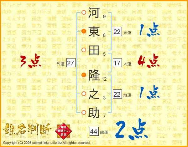 河(9画)東(8画)田(5画) 隆(12画)之(3画)助(7画)
