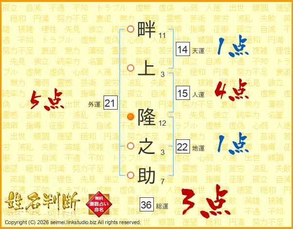 畔(11画)上(3画) 隆(12画)之(3画)助(7画)