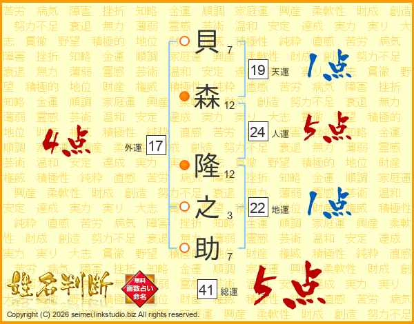 貝(7画)森(12画) 隆(12画)之(3画)助(7画)