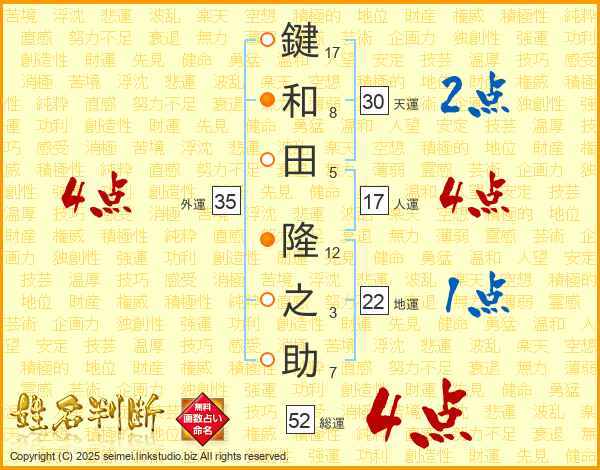 鍵(17画)和(8画)田(5画) 隆(12画)之(3画)助(7画)