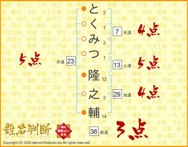 と(2画)く(1画)み(3画)つ(1画) 隆(12画)之(3画)輔(14画)
