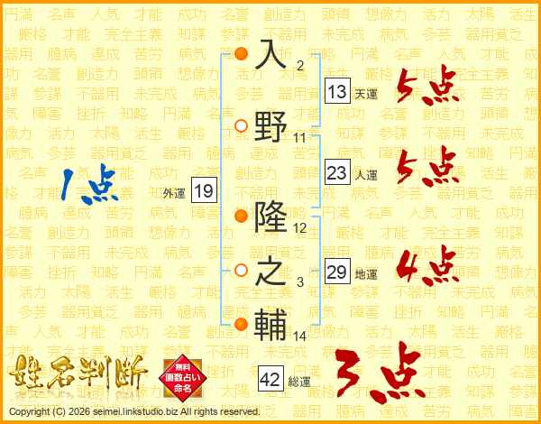 入(2画)野(11画) 隆(12画)之(3画)輔(14画)