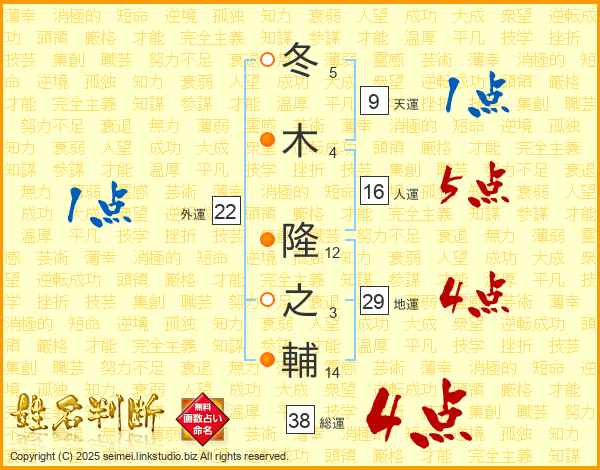冬木隆之輔さんの総運は38画の4点!