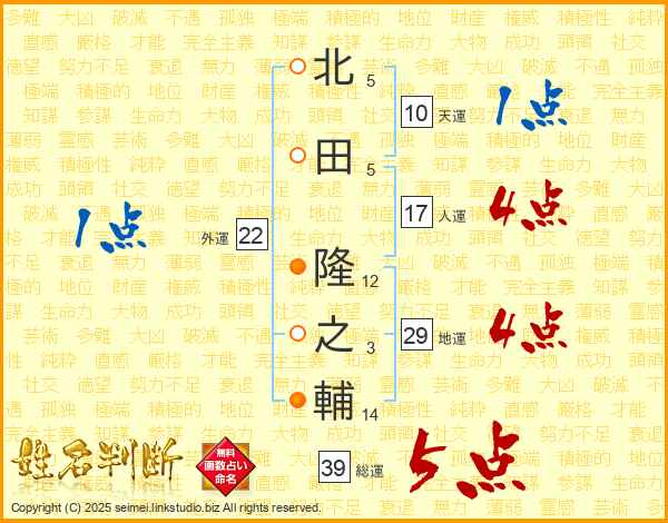 北田隆之輔さんの総運は39画の5点!