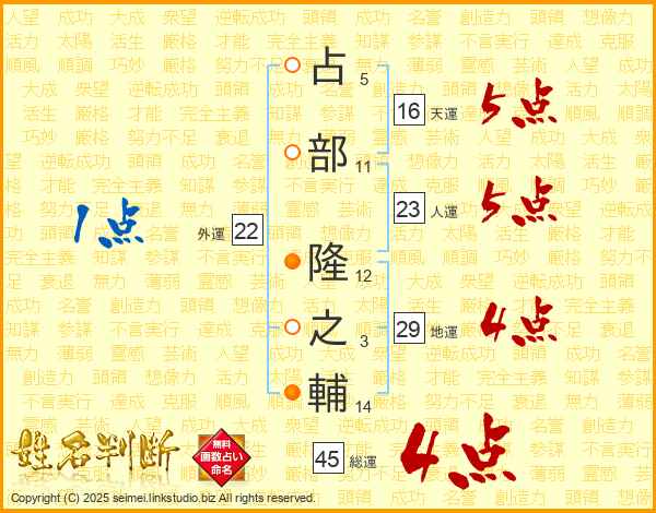 占部隆之輔さんの人運は23画の5点!