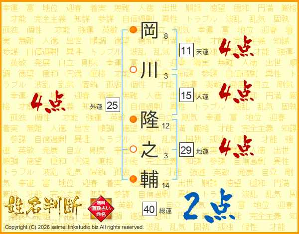 岡(8画)川(3画) 隆(12画)之(3画)輔(14画)