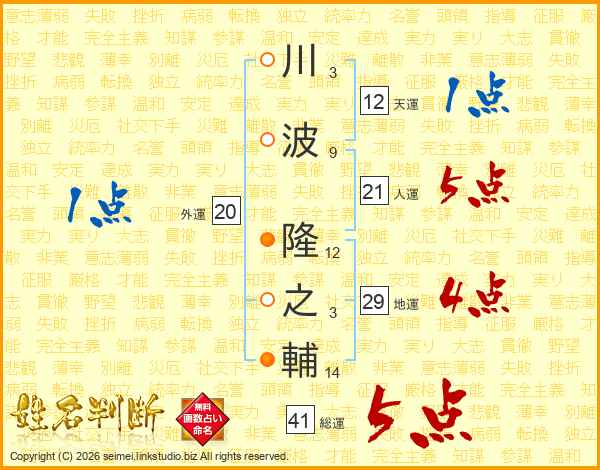 川(3画)波(9画) 隆(12画)之(3画)輔(14画)