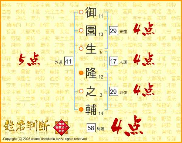 御(11画)園(13画)生(5画) 隆(12画)之(3画)輔(14画)