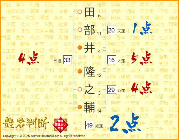 田(5画)部(11画)井(4画) 隆(12画)之(3画)輔(14画)