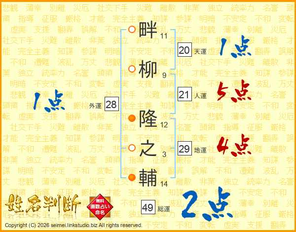 畔(11画)柳(9画) 隆(12画)之(3画)輔(14画)