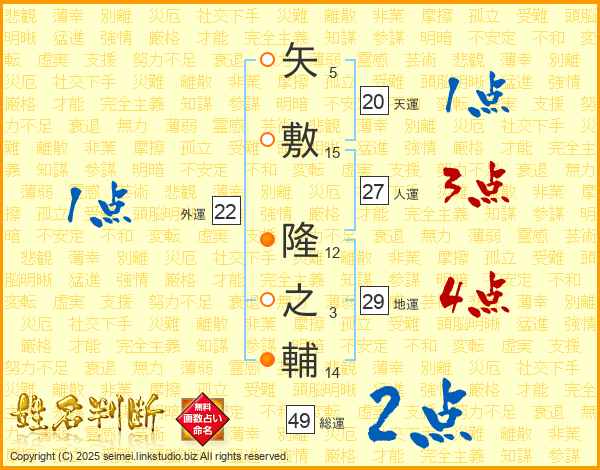 矢(5画)敷(15画) 隆(12画)之(3画)輔(14画)