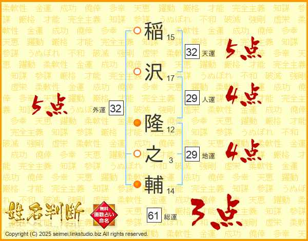 稲沢隆之輔さんの天運は32画の5点!