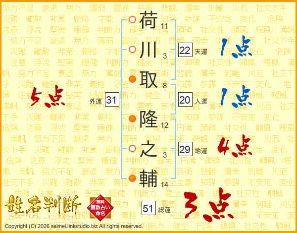荷(11画)川(3画)取(8画) 隆(12画)之(3画)輔(14画)