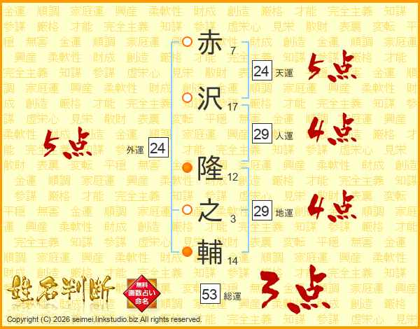 赤沢隆之輔さんの天運は24画の5点!