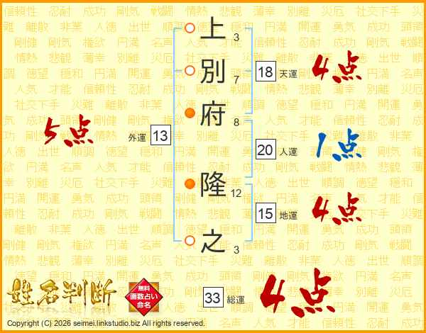上(3画)別(7画)府(8画) 隆(12画)之(3画)