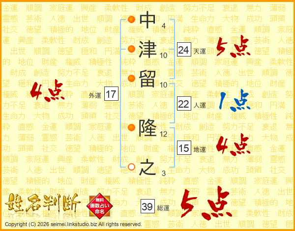 中津留隆之さんの総運は39画の5点!