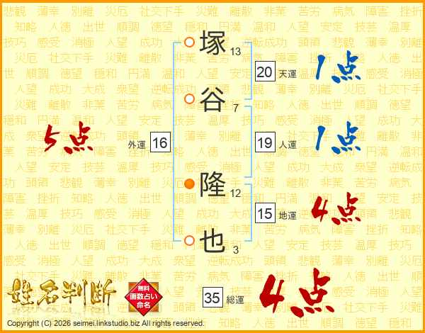 塚谷隆也さんの総運は35画の4点!