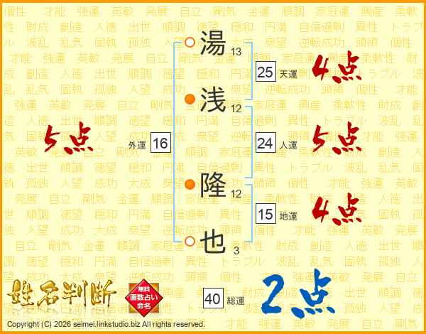 湯(13画)浅(12画) 隆(12画)也(3画)