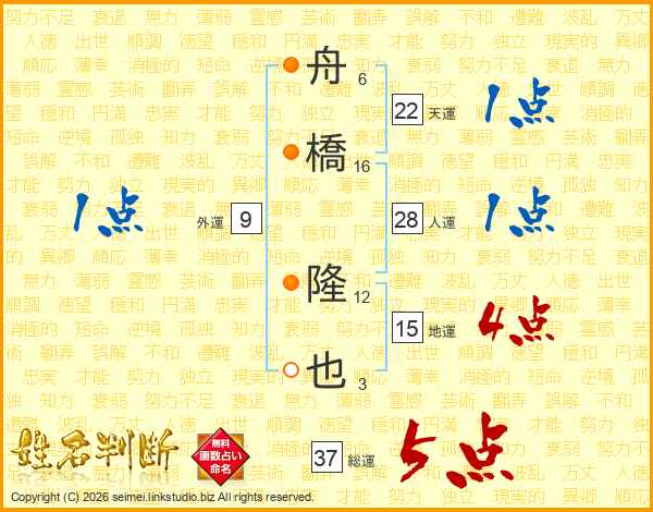 舟橋隆也さんの総運は37画の5点!