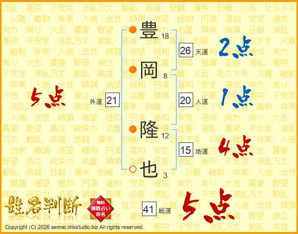 豊(18画)岡(8画) 隆(12画)也(3画)