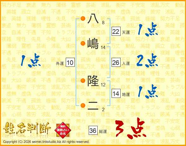八(8画)嶋(14画) 隆(12画)二(2画)