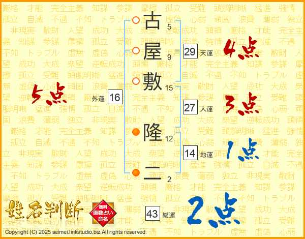 古(5画)屋(9画)敷(15画) 隆(12画)二(2画)