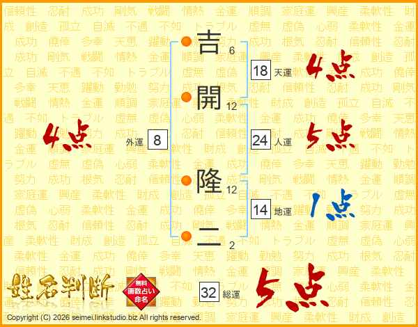 生活面を象徴する運勢です。外部から受ける影響力を表し、結婚運、家庭運や職場、環境への順応性を表します。総運から人運を引いた画数。姓や名が1文字の場合を除く。