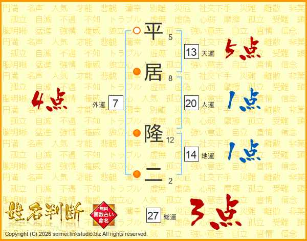 平居隆二さんの総運は27画の3点!