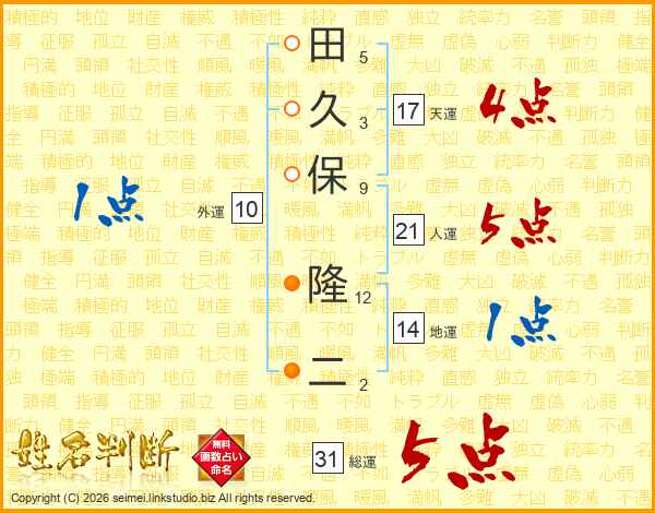 田(5画)久(3画)保(9画) 隆(12画)二(2画)