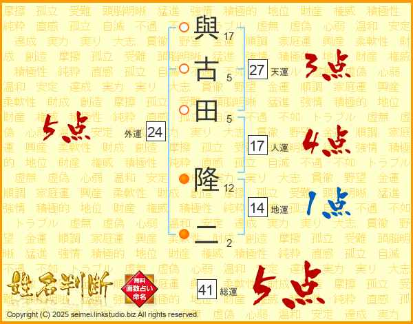 與(17画)古(5画)田(5画) 隆(12画)二(2画)