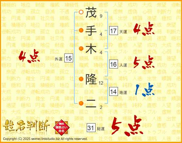 茂手木隆二さんの総運は31画の5点!