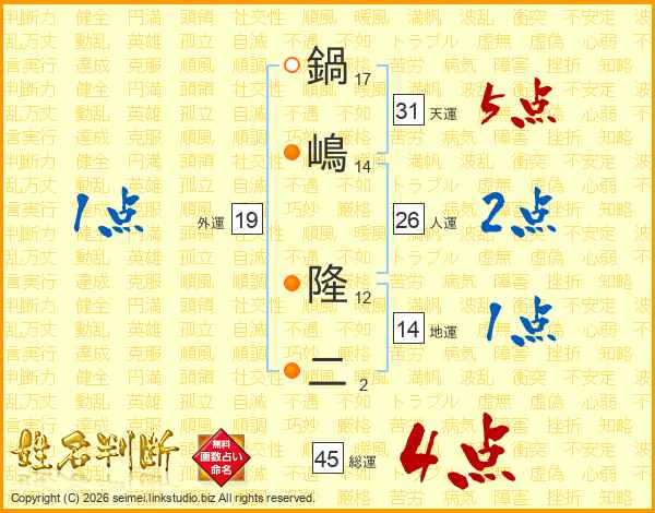 鍋嶋隆二さんの天運は31画の5点!