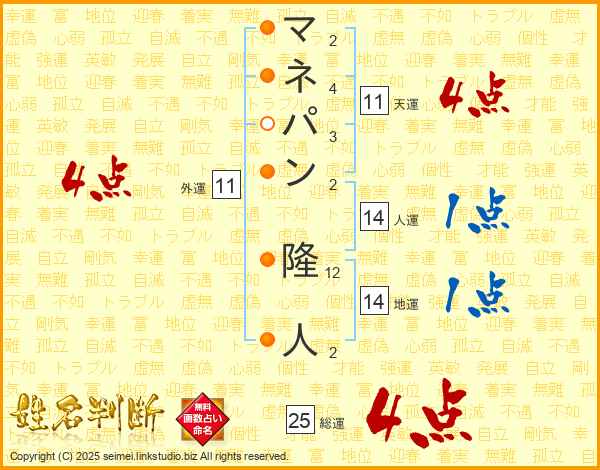 マ(2画)ネ(4画)パ(3画)ン(2画) 隆(12画)人(2画)