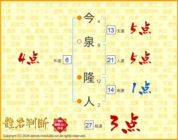 今泉隆人さんの人運は21画の5点!