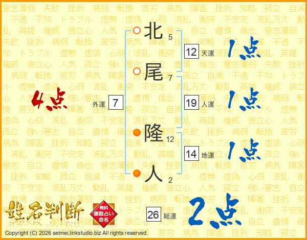 あなたの人生を表す1番重要な運勢です。生涯を通じて影響する総合運となり、主に50歳以降の晩年期に影響を及ぼします。苗字と名前の合計画数。