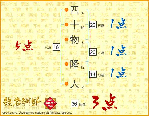 生活面を象徴する運勢です。外部から受ける影響力を表し、結婚運、家庭運や職場、環境への順応性を表します。総運から人運を引いた画数。姓や名が1文字の場合を除く。
