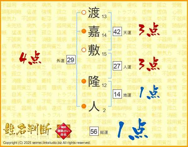 渡(13画)嘉(14画)敷(15画) 隆(12画)人(2画)