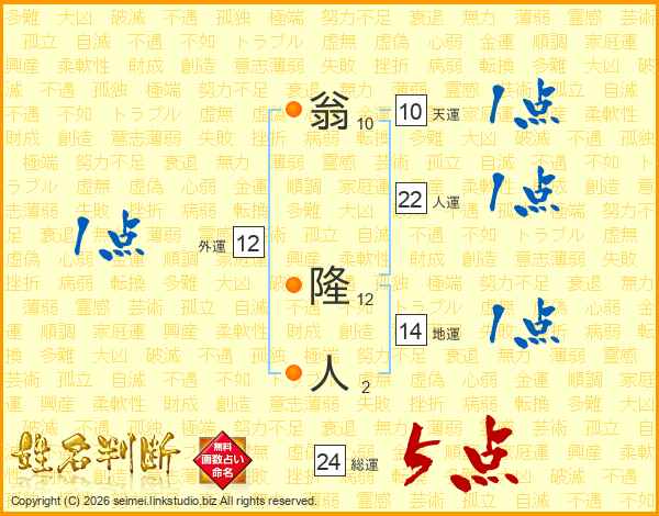 生活面を象徴する運勢です。外部から受ける影響力を表し、結婚運、家庭運や職場、環境への順応性を表します。総運から人運を引いた画数。姓や名が1文字の場合を除く。
