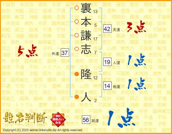 裏(13画)本(5画)謙(17画)志(7画) 隆(12画)人(2画)