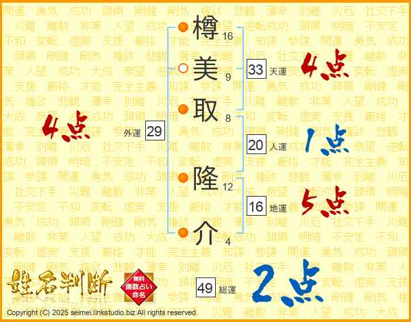 樽(16画)美(9画)取(8画) 隆(12画)介(4画)