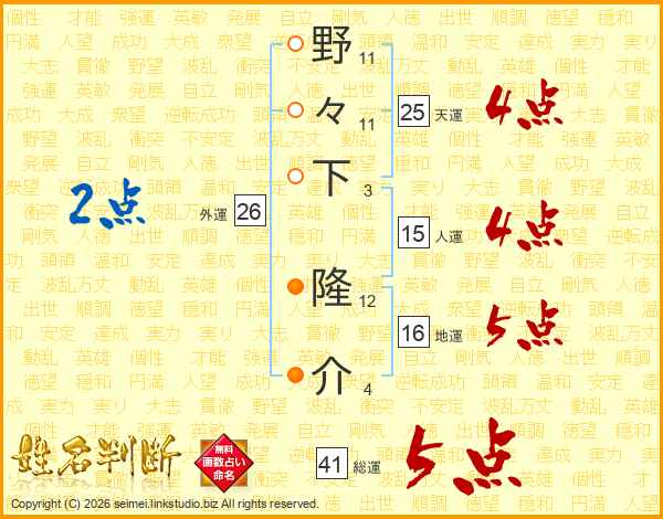 野(11画)々(11画)下(3画) 隆(12画)介(4画)