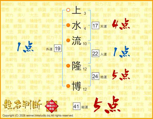 上(3画)水(4画)流(10画) 隆(12画)博(12画)