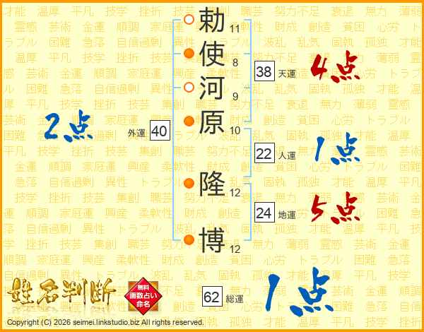 勅(11画)使(8画)河(9画)原(10画) 隆(12画)博(12画)